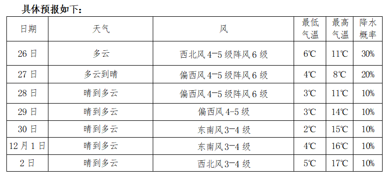 根據(jù)最新氣象資料分析,受較強(qiáng)冷空氣南下影響,25-27日我市將有一次寒潮天氣過程。今天(25日)下午陰有小雨,夜里轉(zhuǎn)陰到多云;25日傍晚前后起冷空氣開始影響我市,48小時最低氣溫降幅8℃左右,并伴有5-6級、沿江江面7級的西北大風(fēng),大風(fēng)天氣于29日逐漸減弱。未來一周我市天氣以晴到多云為主,但受冷空氣持續(xù)影響,早晚氣溫較低,27日至12月1日早晨最低氣溫均在4℃及以下,有霜或霜凍,我市將進(jìn)入氣象意義上的冬天。 防御建議:注意防范大風(fēng)天氣對交通運(yùn)輸、戶外作業(yè)等不利影響;建議做好低溫天氣的能源儲備和調(diào)度等工作,公眾注意及時增減衣物,預(yù)防感冒、心腦血管等疾病的發(fā)生;加強(qiáng)田間管理,防范農(nóng)田低溫凍害。