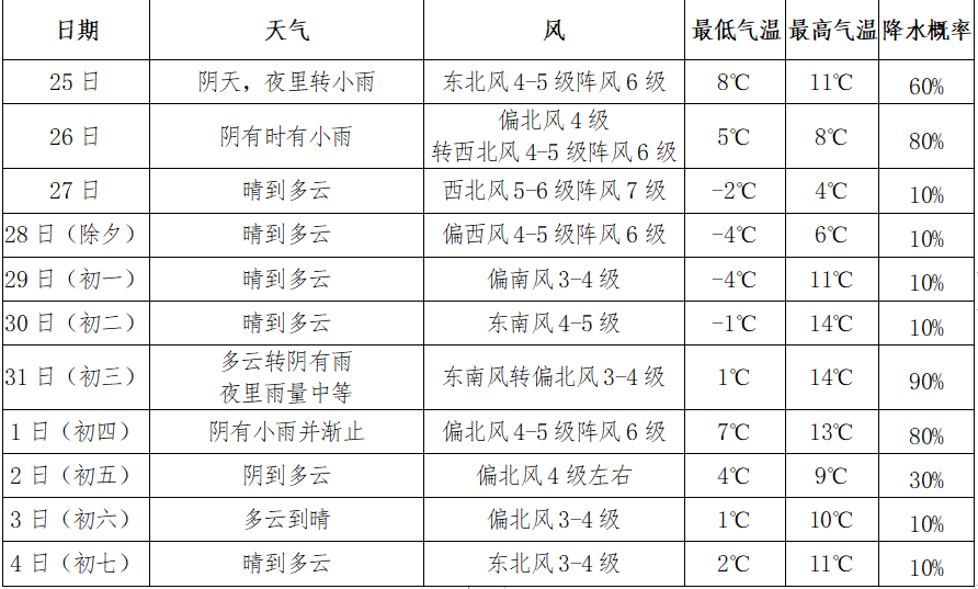 根據(jù)最新氣象資料分析,節(jié)前25日夜里到26日我市有一次小雨過程;26日夜里起受強冷空氣影響,有一次寒潮天氣過程,將出現(xiàn)5-7級西北大風,氣溫明顯下降;27-30日天氣轉(zhuǎn)晴好,氣溫偏低,其中28-29日(除夕至初一)最低氣溫-4℃左右,有嚴重冰凍;29日白天起氣溫逐漸回升,30-31日(初二至初三)最高氣溫升至14℃左右;31-2月1日(初三至初四)將有一次較明顯降雨過程,風力較大;2-4日(初五至初七)天氣轉(zhuǎn)好,受弱冷空氣影響,氣溫有所下降。