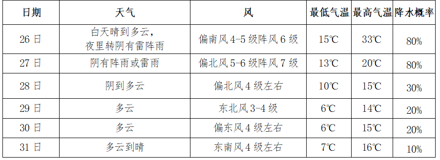 26日白天氣溫繼續(xù)上升,最高氣溫可達(dá)33℃左右;預(yù)計(jì)26日夜里到27日將出現(xiàn)明顯降雨過(guò)程,雨量中等局部大雨,并伴有雷電、雷暴大風(fēng)等強(qiáng)對(duì)流天氣;受強(qiáng)冷空氣南下影響,27日白天起將出現(xiàn)大風(fēng)降溫天氣,偏北風(fēng)將增大至5-6級(jí)陣風(fēng)7級(jí)、江面陣風(fēng)8級(jí),氣溫明顯下降。28日起天氣逐漸轉(zhuǎn)好,29-31日以多云天氣為主,受冷空氣滲透影響,氣溫持續(xù)偏低。具體預(yù)報(bào)如下: