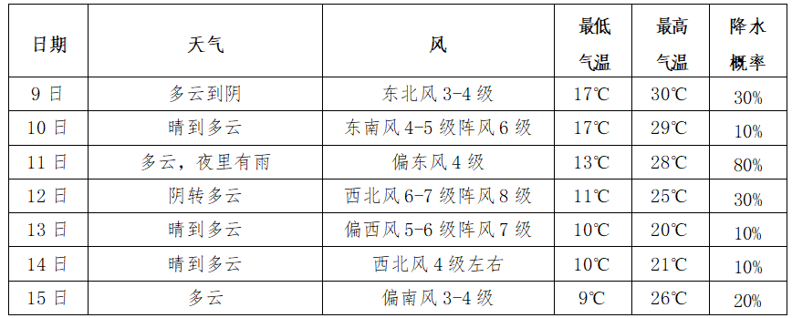 據(jù)最新氣象資料分析,預(yù)計(jì)4月8日到11日白天以多云天氣為主,氣溫較高,最高氣溫30℃左右,11日夜里到12日早晨有一次降水過(guò)程,12日白天天氣轉(zhuǎn)好。受較強(qiáng)冷空氣影響,12-13日將出現(xiàn)大風(fēng)降溫天氣,陣風(fēng)可達(dá)7-8級(jí)。13日天氣開(kāi)始轉(zhuǎn)好,氣溫有所下降,13日早晨最低氣溫10℃左右,白天最高氣溫20℃左右,14-15日最高氣溫逐漸回升。
