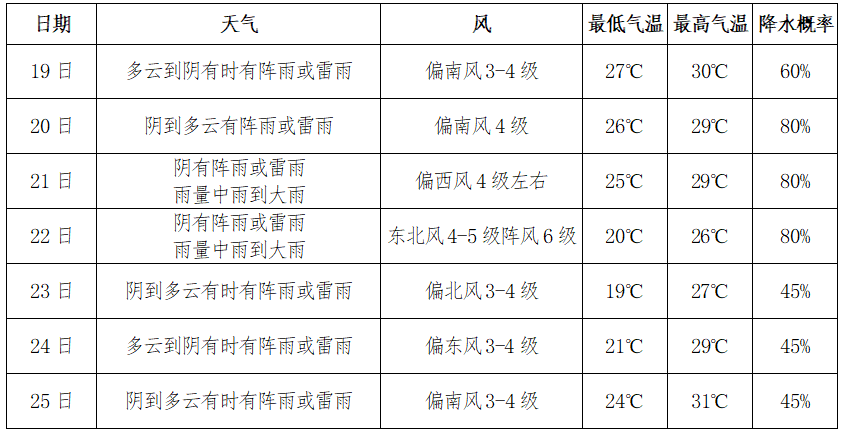 根據(jù)最新氣象資料分析,未來一周(19-25日)我市將多降雨天氣過程,有雷雨時(shí)可能伴有7-9級(jí)雷暴大風(fēng);受降雨影響,日最高氣溫多降至30℃以下。需重點(diǎn)關(guān)注21-22日的較強(qiáng)降雨天氣:雨量中雨到大雨,局部可能伴有短時(shí)強(qiáng)降水、雷電、雷暴大風(fēng)等強(qiáng)對(duì)流天氣,最大小時(shí)雨強(qiáng)20-30毫米。 防御建議:梅雨期間降水頻次增多,需防范短時(shí)強(qiáng)降水、持續(xù)性降水可能造成的城鄉(xiāng)積澇等次生地質(zhì)災(zāi)害;增強(qiáng)氣象災(zāi)害防御意識(shí),及時(shí)關(guān)注強(qiáng)對(duì)流天氣,防范其對(duì)人身安全、交通運(yùn)輸、戶外作業(yè)及農(nóng)業(yè)生產(chǎn)等的不利影響。 具體預(yù)報(bào)如下: