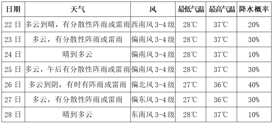 未來一周高溫仍將持續(xù),注意防范高溫熱害 受副熱帶高壓影響,8月13日以來,我市大部分地區(qū)出現(xiàn)35℃以上高溫天氣。截至8月21日,今年我市已出現(xiàn)36個高溫日。未來一周我市仍受副熱帶高壓控制,日最高氣溫將維持在36~37℃。 23-28日,我市天氣以云系變化為主,多分散性陣雨或雷雨。 具體預報: