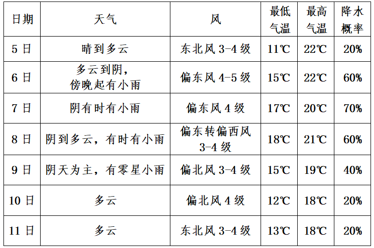 據(jù)最新氣象資料顯示,明天我市晴到多云;6日云系增多,6日傍晚至 8日多小雨過程;9日天氣逐步轉(zhuǎn)好。氣溫方面:未來幾天最高氣溫變化不大,5日早晚較涼,6日起早晚氣溫有所升高;9日后期受冷空氣影響,氣溫將再次下降。請抓好有利天氣,加快秋收秋種進(jìn)度。