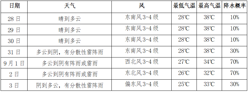 受強(qiáng)盛的副熱帶高壓控制,本輪高溫將持續(xù)到月底,極端最高氣溫38℃左右;9月1日起北方冷空氣勢力有所增強(qiáng),副熱帶高壓減弱東退,將多雷陣雨天氣,我市最高氣溫有望降至35℃以下,連續(xù)高溫天氣將有所緩解。